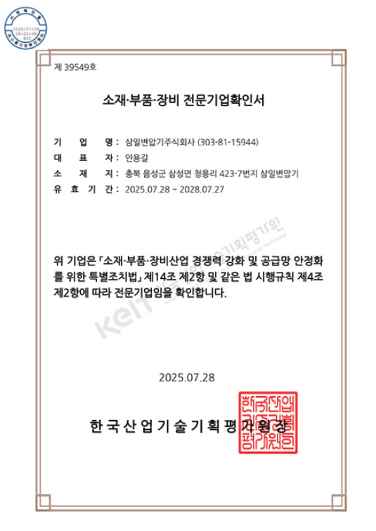 Certificate of Specialized Company for Materials, Parts, and Equipment